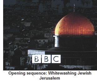 A taste of things to come arrives in the first few seconds of the broadcast, which features images of Islam’s Dome of the Rock and a Christian crucifix against a Jerusalem backdrop. Despite the deep religious connection of Judaism to both Jerusalem and the land of Israel, this image is, incredibly, omitted. And herein lies the major flaw of the entire program – the legitimate roots of the Jewish people in the Land of Israel going back three millenia are either downplayed, delegitmized or ignored altogether.